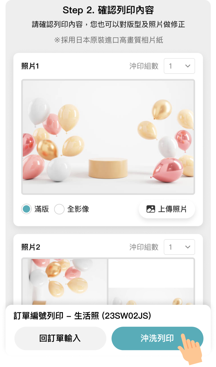 4. 重新確認您要列印的產品是否正確並選擇「沖洗列印」送出
